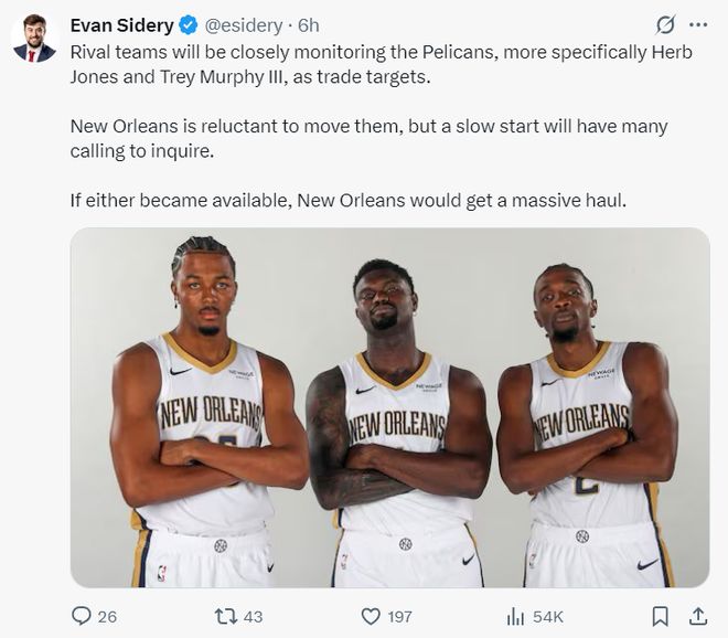 北京时间10月4日,NBA记者埃文-斯迪瑞报道,多支竞争对手密切关注鹈鹕,特别是赫伯特-琼斯与特雷-墨菲这两位侧翼球员。目前鹈鹕还不愿意交易他们,但如果新赛季开局不利并接到大量