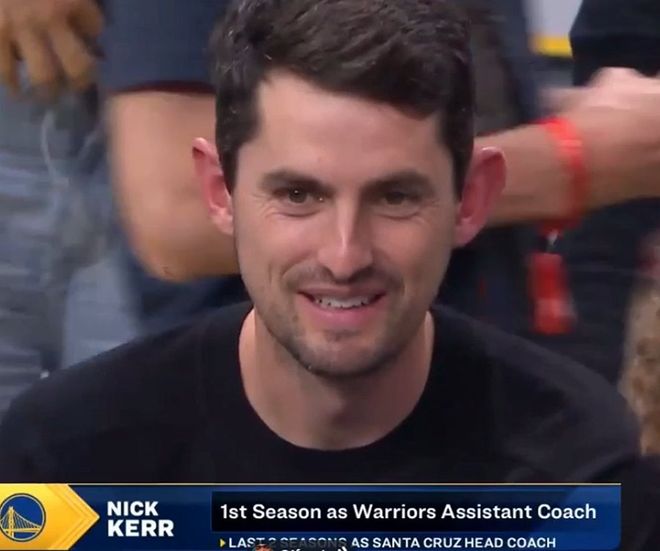 雷速体育10月9日讯 今日NBA季前赛,勇士129-123战胜开拓者。赛后,美媒NBA Memes晒出转播方所显示的画面,其中显示科尔儿子尼古拉斯·科尔已成为勇士助教。小科尔此前圣克鲁斯勇