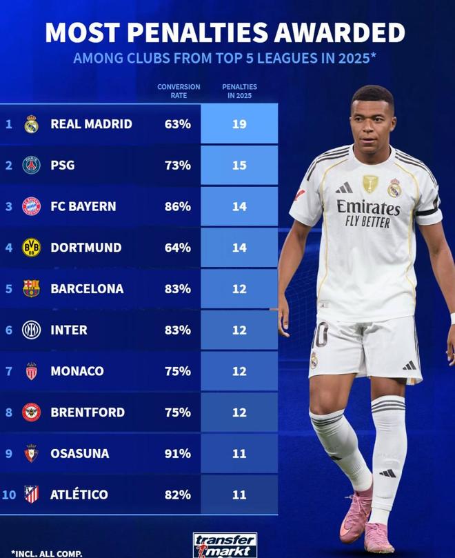 2025年五大联赛俱乐部获得点球数TOP10:皇马、巴黎、拜仁前3